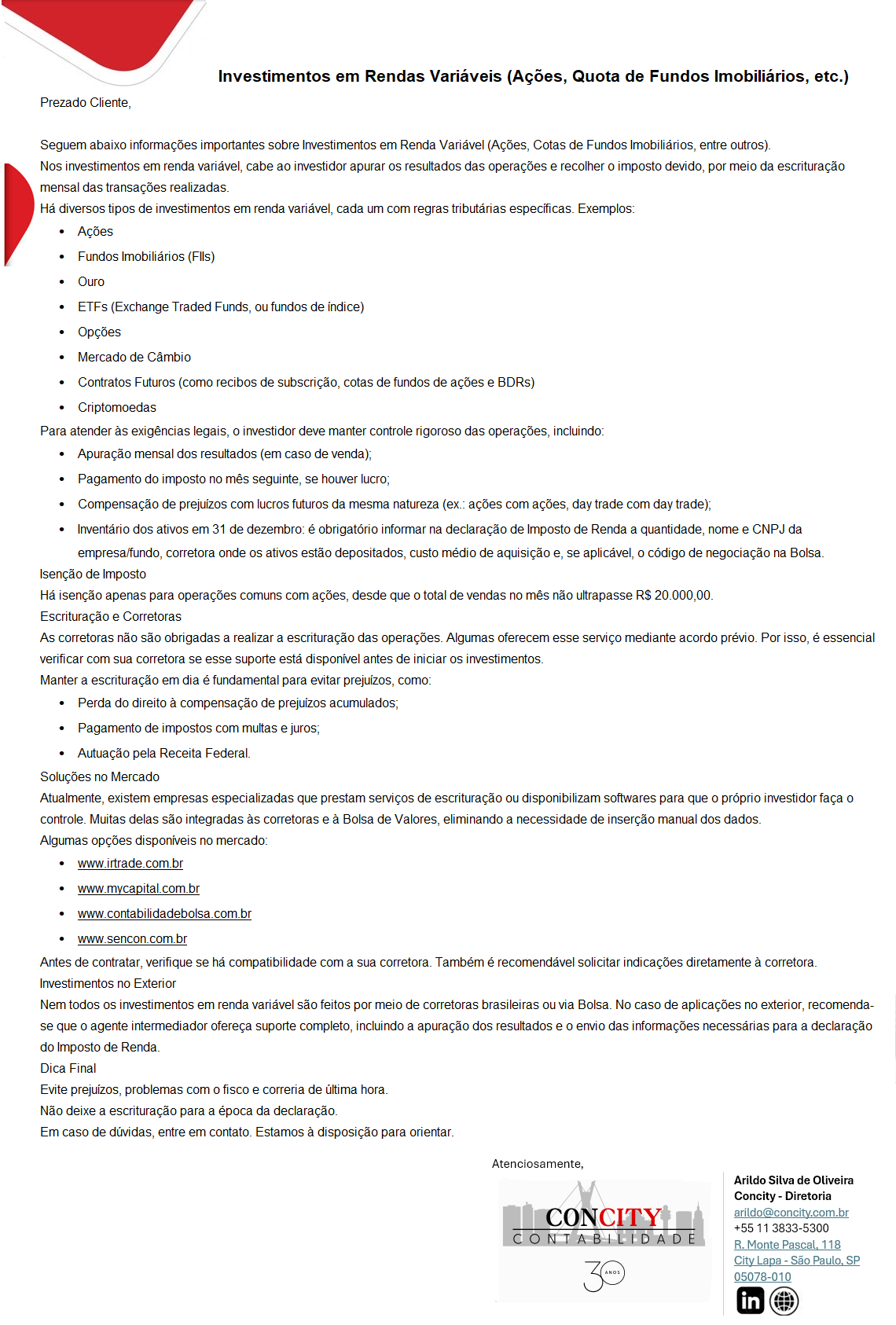 Investimentos em Rendas Variáveis (Ações, Quota de Fundos Imobiliários, etc.)
