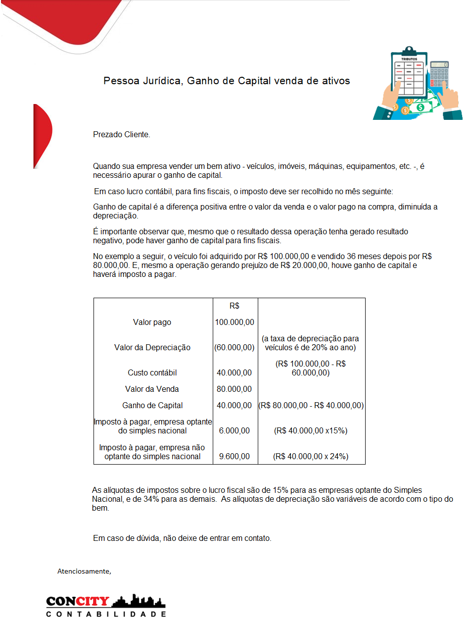 Pessoa Jurídica, Ganho de Capital venda de ativos