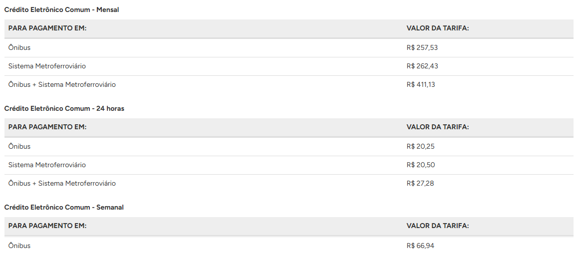 - A tarifa de R$ 5,30, paga com Crédito Eletrônico Comum Ônibus, permite até quatro embarques em ônibus diferentes, no período de três horas.